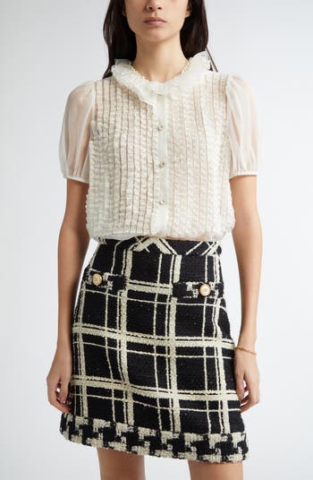 Dainty ruffles frill the front of this short sleeve top crafted of whisper-light silk chiffon and finished with a ruffled stand collar.