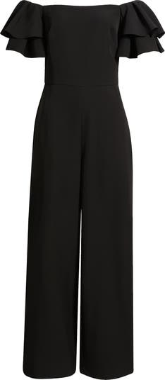 Layered ruffle sleeves add volume and movement to this shoulder-baring jumpsuit finished with drapey wide legs.