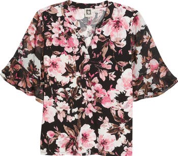 Frill-trimmed sleeves add charm and fluttering movement to this soft stretch-kissed top romanced by delightful blooms.