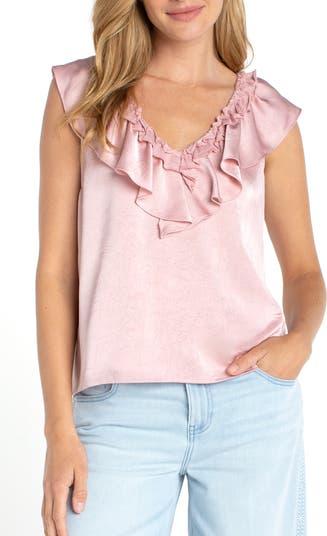 Fluttering ruffles add texture and movement to this satiny top made with a soft knit back.