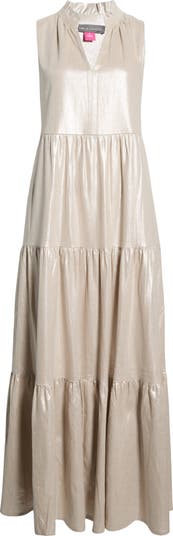 A naturally breathable linen blend keeps you moving through your day feeling confident in this sleeveless maxi dress featuring a ruffled split neck and a flowy tiered skirt.