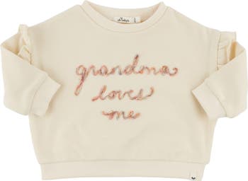 This comfy slouch sweatshirt has ruffles on the shoulders and a sweet "grandma loves me" embroidered message in soft neutral yarn. Cozy, cute, and made to feel extra special. Designed in Minnesota. Available in infant, toddler and girls sizes.