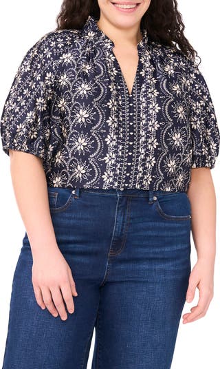 Breeze through your day in this playfully flower-tossed top framed by a ruffled split neck and sweetly puffed raglan sleeves.