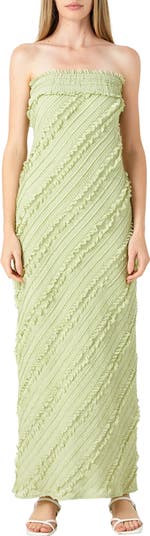 Fanciful frilly trim romances this luscious chiffon maxi designed in a sleek strapless silhouette.