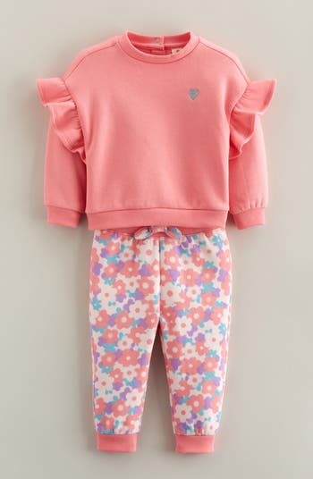 Keep baby comfortable no matter where the day heads in this ruffly crewneck sweatshirt and joggers set cut from cozy, cotton-rich fleece.