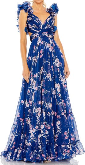 Ruffle Tiered Floral Cut-Out Chiffon Gown