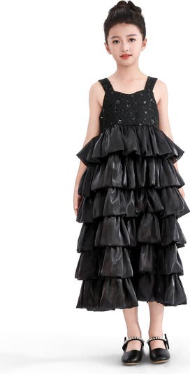 A show-stopping silhouette for the most glamorous occasions, this sleeveless dress features a richly textured bodice and a dramatic cascade of glossy ruffles that shimmer with every step.