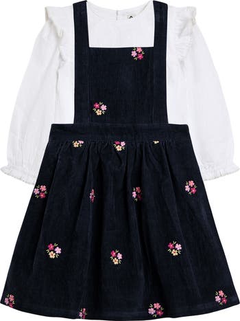 A ruffled layer-loving shirt brings plenty of charm to your child's look when paired with this floral-embroidered dress made from plush wide-wale corduroy.