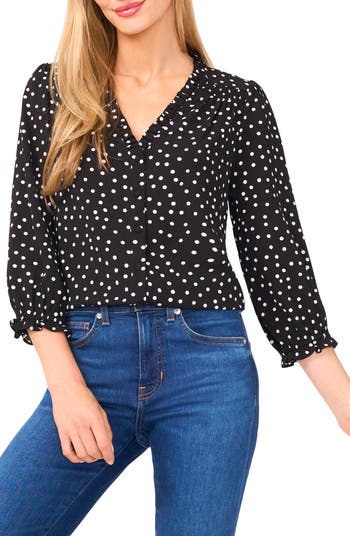 Billowed three-quarter sleeves frame this lightweight V-neck top trimmed with fanciful frills.