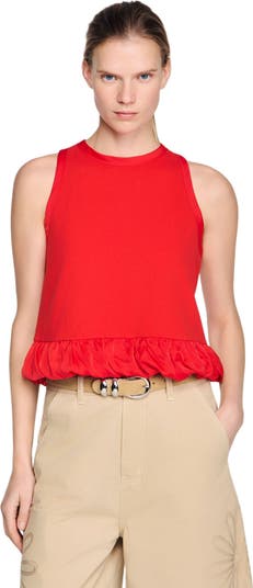 Sleeveless round-neck top with a double ruffle at the hem and a tie at the back.