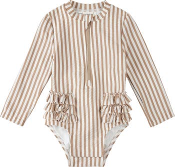 Your little one can splash the day away in this long-sleeve swimsuit trimmed in frilly ruffles and cut from quick-drying fabric with built-in protection from the sun's harsh rays.