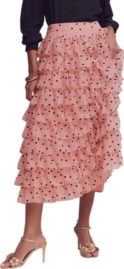 A bright polka dot pattern accentuates the tiered ruffles of this fun and fanciful A-line skirt.