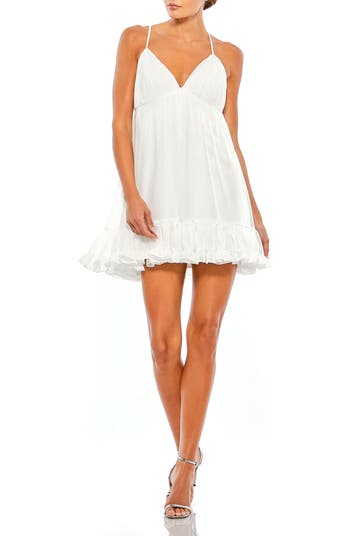 Flirty spaghetti strap chiffon babydoll dress with a V-neckline, crisscross back, and ruffled hem—perfect for a playful and stylish look.