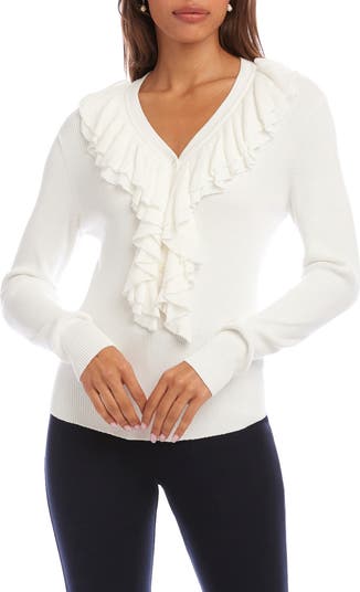 Frilly ruffles trim the V-neckline of this form-fitting sweater that's textured in soft ribbing, making it a sweet addition to your cold-weather wardrobe.