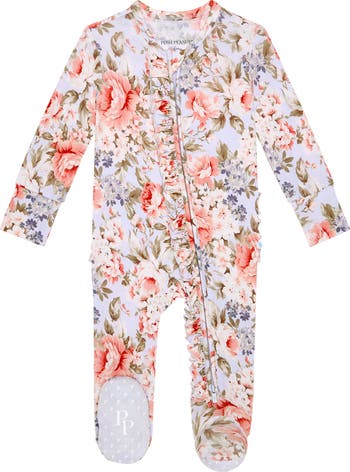 Vibrant blooms and ruffles bring abundant charm to this zip footie made from a soft and stretchy knit with grips on the feet for steady standing and stepping.