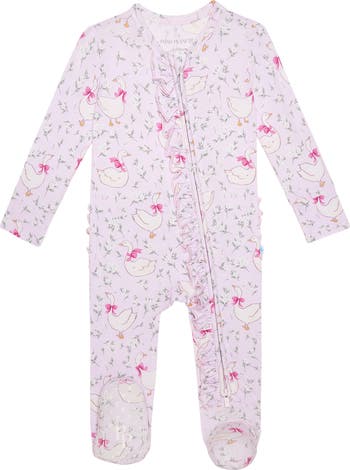 Cut from buttery-soft fabric, baby will love to lounge in this patterned footie edged in charming ruffles and built with a zipper that goes from chin to ankle for easy diaper changes.
