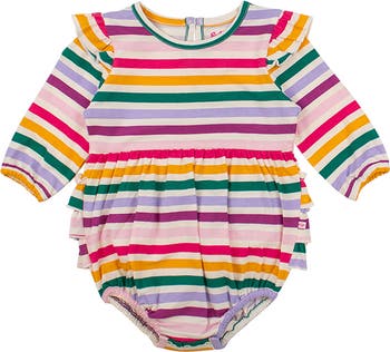 Signature ruffles lend added frill to this striped bodysuit that will keep baby crawling in the comfort of stretchy cotton.
