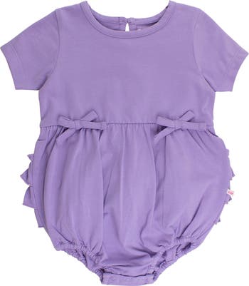 Knit Short Sleeve Bow Bubble Romper is the perfect outfit. This charming girls knit romper features delightful signature rear ruffles and a stylish bow detail that adds a touch of elegance to your baby girl's wardrobe. The romper boasts a keyhole back design with snap closures for easy changing, ensuring convenience for parents and comfort for your little one. Designed with a 4-way stretch fabric, this baby romper allows ample movement, making it ideal for playtime or naptime. The durable fabric not only resists fading and snagging but also maintains its vibrant hue and quality through frequent washes. The bubble romper with snaps offers full seat coverage, combining practicality with fashion.