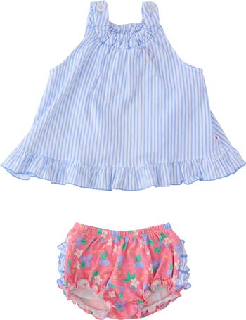 Knit Swing Top and Bloomer Set is the perfect addition to your little girl's wardrobe, featuring a charming swing top set with playful ruffle details and matching girls elastic waist bloomers. Crafted from stretchy knit fabric, this girls set is designed to provide comfort and durability with its 4-way stretch material that resists fading, pilling, and snagging, ensuring it stays vibrant and intact through all her adventures. The top includes a button closure for easy dressing, and both pieces boast signature rear ruffles, adding a touch of whimsy to this adorable toddler bloomer set. Ideal for daily wear or special occasions, this 2-piece swing top bloomer set offers style and practicality, making it a must-have in your toddler's collection.