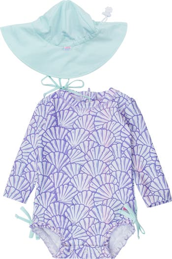 They'll be all set to splash and play in this ruffled swimsuit featuring long sleeves and a matching hat to block out the sun, sand and surf.