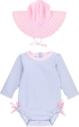 Seersucker stripes pattern a long-sleeve rashguard swimsuit featuring ruffles across the butt and a coordinating sun hat.