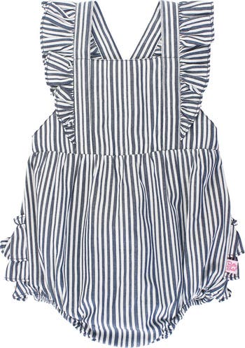 Fluttery crisscrossed straps and a breezy open back dial up the cute factor for your baby on a ruffled romper made from soft cotton.
