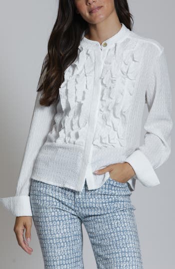 Frothy ruffles tumble down the front of this button-up that brings rich texture to your desk-to-dinner look.
