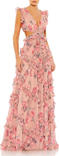 Mac Duggal Ruffled Cut Out Cap Sleeve V Neck Gown, Main, color, Rose Multi