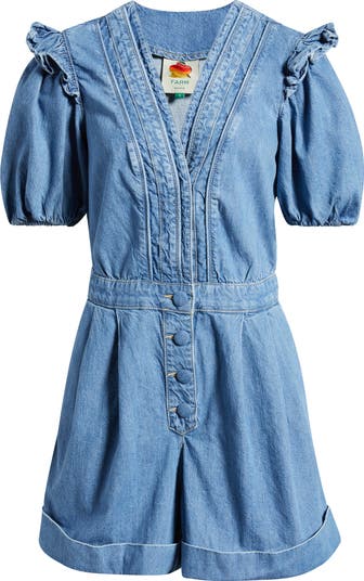Perfect for the sunlit days to come, this playful denim romper is cut with a plunging neckline and voluminous puff sleeves capped with accordion ruffles. The relaxed silhouette is complemented by cuffed legs and covered buttons at the fly to blend casual comfort with a nostalgic retro aesthetic.