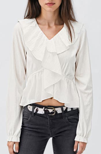 A gauzy texture and cascading ruffles lend rich texture and visual interest to a woven top rendered in a solid hue for easy pairing.