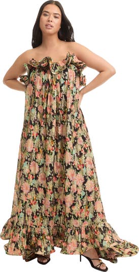 Turn heads in this stunning metallic maxi dress, featuring a flattering ruffled yoke design with adjustable straps and a full sweep that flows into a hem ruffle for added drama and movement. Ideal for any special occasion, this dress combines sleek sophistication with modern flair.