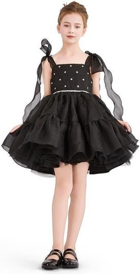 A dazzling choice for magical moments—this shimmering silhouette blends soft movement with elegant detail, perfect for parties, pageants, or winter celebrations. Glitter-embellished bodice with flutter sleeves and rhinestone trim. Voluminous tiered skirt with soft ruffles and a fairytale finish.