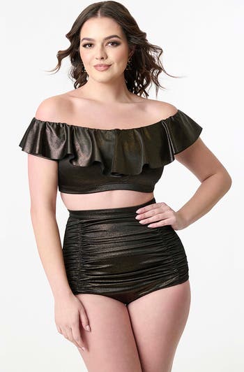 Unique Vintage Ruffled Ramona Swim Top, Main, color, Black Gold Shimmer