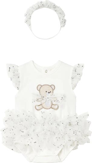 Sweet and playful, this romper brings a charming look to special moments. The ruffled sleeves and embroidered bear add a cute touch, while the soft tulle skirt creates a light, whimsical finish.