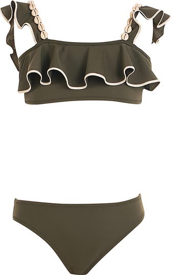 This striking olive green bikini features a voluminous ruffled top, beautifully defined by a crisp white contrast-stitch edge. The design is uniquely elevated by shoulder straps embellished with hand-finished cowrie shells, offering a high-fashion, boutique-inspired finish that stands out at every poolside occasion.