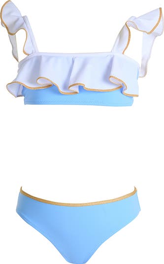 This striking two-piece features a pristine white bodice detailed with voluminous ruffles at the neckline and shoulders, seamlessly transitioning into a serene azure blue base. The entire silhouette is elegantly framed with shimmering metallic gold piping, offering a "jewelry-like" finish that catches the light with every splash.
