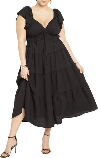 This maxi dress features a sweetheart neckline and a tiered skirt, with a bodice that is lined for comfort, offering a relaxed yet cinched waist silhouette.