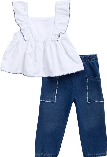 Scalloped stitching adds to the charming look of a ruffled top and denim leggings set that has baby looking oh-so sweet.