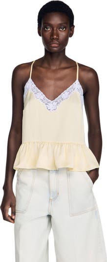 Flowing satin-effect top with adjustable spaghetti straps, lace trim at the neckline and a wide gathered ruffle at the hem.