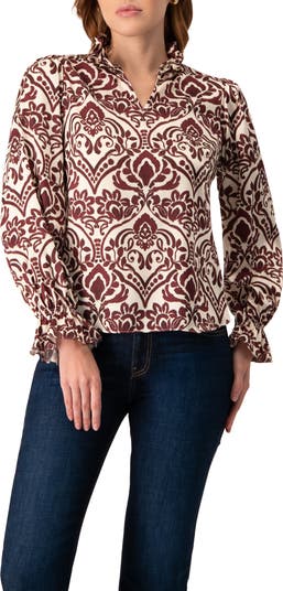 Abstract print blouse featuring long sleeves, a V-neckline with back ruffled high neck