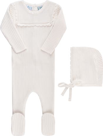 This adorable set features a charming ruffled-yoke footed romper and bonnet made in a soft cotton knit that's sure to keep baby cozy.