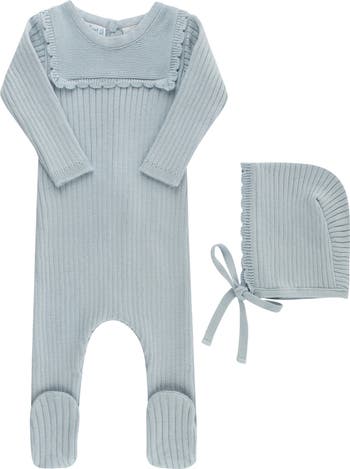 This adorable set features a charming ruffled-yoke footed romper and bonnet made in a soft cotton knit that's sure to keep baby cozy.