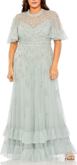 Dazzle in our plus-size embellished flutter sleeve gown with ruffle tiers. Elegant embellishments and graceful sleeves make it perfect for any formal event.