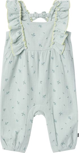 Let your baby girl enjoy her day in comfort and style with this romper featuring a cute print! Crafted from 100% cotton, it's designed to be gentle on sensitive skin, making it perfect for everyday wear. The convenient leg snaps make diaper changes easy, while hidden grippers ensure the romper stays in place during all her playtime adventures. Cinched ankles keep the pant legs from riding up, and the ruffled shoulder straps add an extra touch of charm. This romper is as practical as it is adorable, making it a must-have for any little one! Our essentials have been independently certified with STANDARD 100 by OEKO-TEX® so that you don’t have to worry about harmful substances in your baby’s wardrobe. Pack includes one romper.
