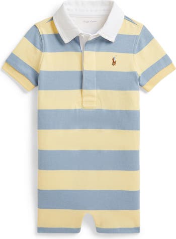 Smooth cotton jersey feels supersoft against baby's skin in this sporty striped romper embroidered with Ralph Lauren's preppy polo rider—iconic since its '71 debut. Better yet, concealed snaps make quick changes a cinch.