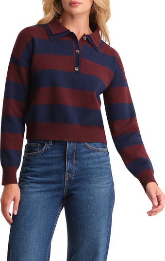 A layered collar complements the bold stripes of this modern long-sleeve polo made partially with recycled fibers.