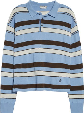 This rugby-stripe polo-sweater is knit in Italy from a combination of misty-blue matte cotton yarn and high-shine viscose in a relaxed, drop-shoulder silhouette.