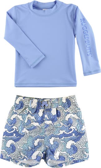 Get baby ready to splash and play in this swimsuit featuring a protective long-sleeve rashguard and coordinating trunks patterned in an abstract ocean design.