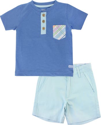 Get your little one ready for cheery blue skies in this breezy cotton-blend ensemble with a pastel madras pocket, short sleeves and stylish twill shorts.