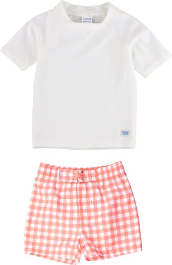Baby can splash and play longer under the rays in this sun-protective duo pairing a stretchy short-sleeve rashguard with gingham-patterned swim trunks.